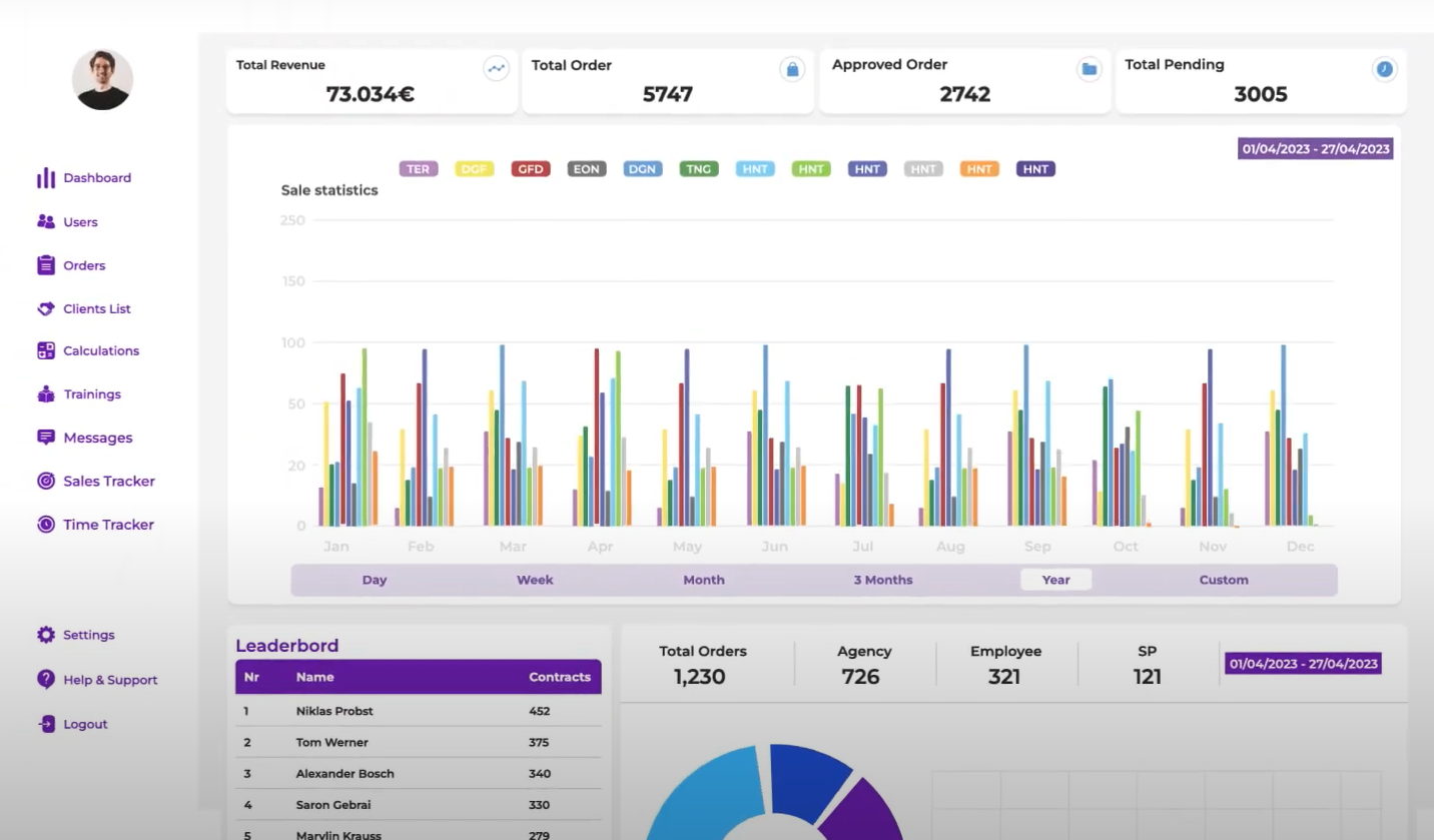 Sales menagment, menage orders, sales results and team sales, status of order, calculations